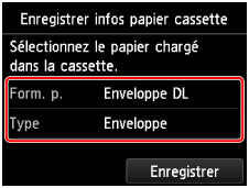 8. Sélectionnez le format et le type des enveloppes chargées dans la cassette dans Form. p. et Type, puis touchez Enregistrer.