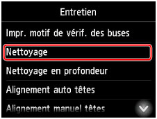 Une fois le nettoyage terminé, un écran de confirmation s'affiche pour procéder à l'impression du motif de vérification des buses.