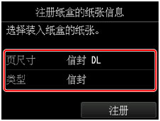 在页尺寸和类型中选择装入纸盒的信封尺寸和类型,然后点击注册。