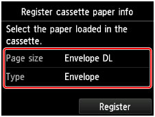 V ponuke Veľk. str. (Page size) a Typ (Type) vyberte veľkosť a typ obálky v kazete a klepnite na tlačidlo Registrovať (Register).