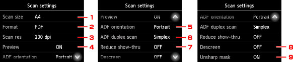 øverst til venstre på den berøringsfølsomme skærm for at kontrollere meddelelsen og ændre indstillingen. - De angivne scanningsindstillinger ud over ADF-retning (ADF orientation) og ADF dupleksscan. (ADF duplex scan) såsom scanningsstørrelse, opløsning og dataformat bevares, også selvom printeren slukkes.