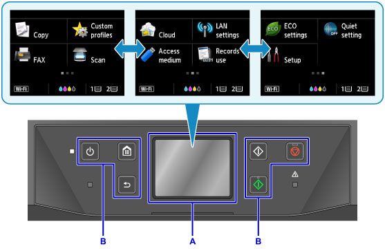 Das Bedienfeld besteht aus einem Touchscreen (A) und Tasten (B).