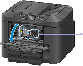 Die Tintenbehälter, die Sie ersetzen können, werden auf dem Touchscreen angezeigt, und der Druckkopfhalter (A) wird in die für den Austausch dieser Tintenbehälter erforderliche Position bewegt.