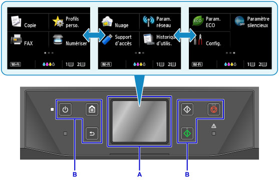 Le panneau de contrôle est doté d'un écran tactile (A) et de boutons (B).