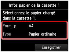 Sélectionnez le format et le type du papier chargé dans la cassette dans Form. p. et Type, puis touchez Enregistrer.