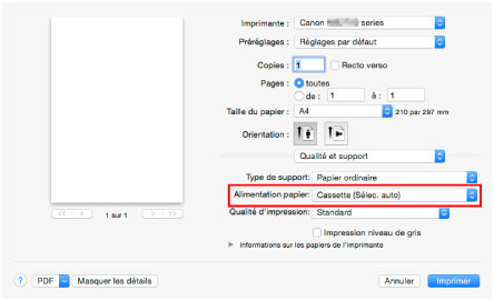 Dans Alimentation papier, sélectionnez la cassette dans laquelle le papier est chargé.