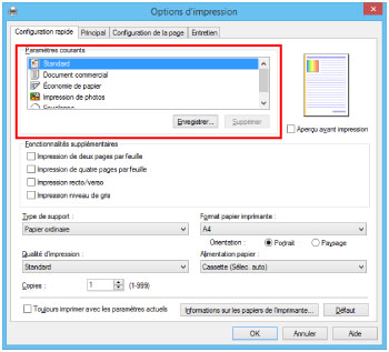 Dans le champ Paramètres courants de l'onglet Configuration rapide, sélectionnez un profil adapté à votre tâche d'impression.