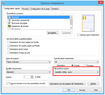 Dans Alimentation papier, sélectionnez la cassette dans laquelle le papier est chargé.