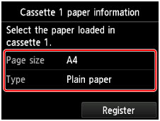 Укажите размер и тип загруженной в кассету бумаги в разделах Разм. с. (Page size) и Тип (Type), а затем коснитесь кнопки Зарегистрир. (Register)