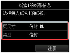 在页尺寸和类型中选择装入纸盒的信封尺寸和类型,然后点击注册。