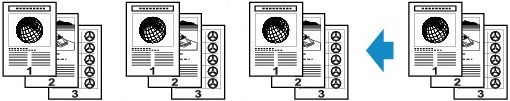عند تحديد ON لـ Collate في Copy، يمكنك الحصول على نُسخ مطبوعة مرتبة عند طباعة نُسخ متعددة من مستند أصلي متعدد الصفحات. بالإضافة إلى ذلك، يمكنك نسخ صفحات أصلية على وجهي ورقة واحدة.