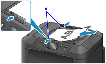 Регулирайте водачите за документи (A) спрямо ширината на документа.