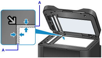Защрихованата област (A, 1 мм (0,04 инча) от краищата на стъклото на скенера) е извън областта за сканиране.