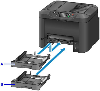 Hârtia poate fi încărcată în caseta 1 (A) şi în caseta 2 (B).