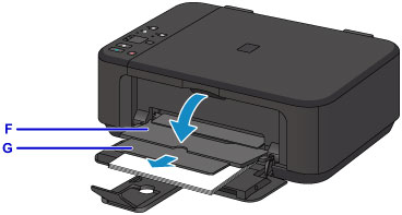 Åpne forsiktig papirutmatingsbrettet (F), og trekk deretter ut papirutmatingsstøtten (G).