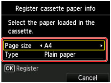 بعد دفع الدرج للخلف، يتم عرض شاشة تسجيل معلومات الورق على شاشة LCD. حدد A4 أو Letter للإعداد Page size وPlain paper للإعداد Type، ثم اضغط على الزر موافق (OK).