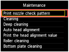 Ylläpito (Maintenance) ja paina sitten OK-painiketta.Ylläpito (Maintenance) -näyttö tulee näkyviin.