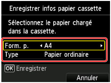 Une fois que vous avez poussé la cassette vers l'arrière, l'écran d'enregistrement des informations sur le papier s'affiche sur l'écran LCD. Sélectionnez A4 ou Lettre pour Form. p. et Papier ordinaire pour Type, puis appuyez sur le bouton OK.