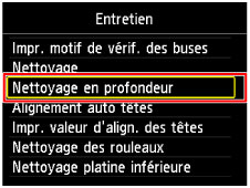 Si le nettoyage standard de la tête d'impression ne permet pas d'améliorer la qualité d'impression, procédez à un nettoyage en profondeur de la tête d'impression. Le nettoyage en profondeur de la tête d'impression requiert une plus grande quantité d'encre qu'un nettoyage normal de la tête d'impression : vous ne devez donc nettoyer la tête d'impression qu'en cas d'absolue nécessité.