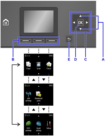 Untuk memilih menu, tekan tombol Fungsi(Function) kiri, tengah, atau kanan (B).