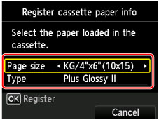 ).După ce împingeţi caseta înapoi, ecranul de înregistrare a informaţiilor despre hârtie se afişează pe LCD.