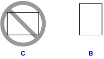 قم بتحميل الورق دائمًا بالاتجاه الطولي (B). يمكن أن يؤدي تحميل الورق بالاتجاه العرضي (C) إلى انحشار الورق.