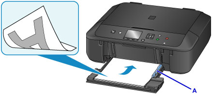 Geser pemandu kertas kanan (A) untuk menyejajarkan pemandu kertas dengan kedua sisi tumpukan kertas.