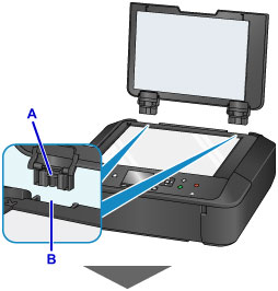 아래 그림에서 보여준 것과 같이 문서 커버의 두 돌출부(A)를 홀더(B)에 맞추고 문서 커버의 두 돌출부를 수직으로 삽입합니다.