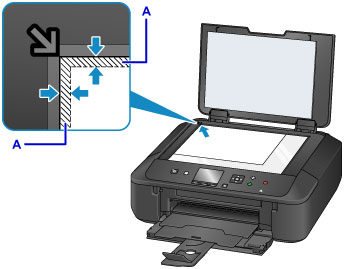 Padėkite dokumento originalą ant ekspozicinio stiklo NUSKAITOMĄJA PUSE ŽEMYN palikdami 1 cm (0,4 col.) arba didesnį tarpą tarp ekspozicinio stiklo kraštų (įstrižai subrūkšniuota sritis). Ant įstrižai subrūkšniuotos srities uždėta dalis nebus nuskaityta.