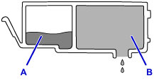 Rašalo talpykloje yra (A) rašalo saugykla ir (B) rašalą sugerianti kempinė.