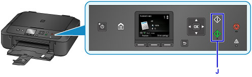 Confirme as configurações do papel e, em seguida, pressione o botão Preto (Black) ou Colorido (Color) (J).