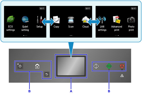 Ovládací panel tvoří dotyková obrazovka (A) a tlačítka (B).