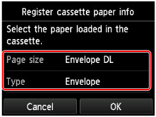 Select the size and type of the loaded envelopes in the cassette at Page size and Type, then tap OK.
