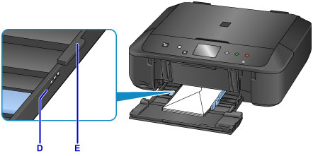 Keep the envelope stack height below the tabs (E) of the paper guides.