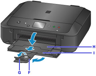 Open the paper output tray (H) gently, then extend the paper output support (I).