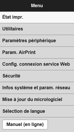 Lorsque vous y accédez, les informations sur l'imprimante s'affichent dans le navigateur de votre ordinateur, de votre smartphone ou de votre tablette.