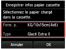 Sélectionnez la taille et le type du papier chargé dans la cassette dans Form. p. et Type, puis appuyez sur OK.