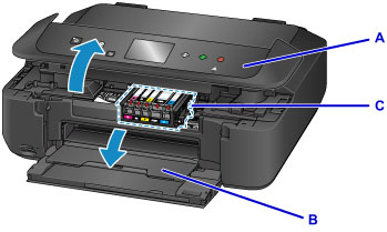 Nyissa ki a kezelőpanelt (A), majd nyissa ki a papírgyűjtő tálcát (B).
