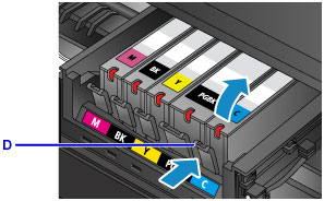 Nyomja be a fület (D), és emelje ki a tintatartályt.