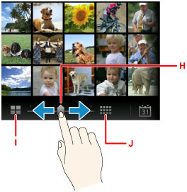 Potiahnutím posúvača H doľava alebo doprava zmeňte počet fotografií zobrazených na obrazovke. Zmeníte ho aj ťuknutím na ikonu I alebo J.