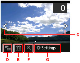 ลากแถบสไลด์ H ไปทางซ้ายหรือขวาเพื่อเปลี่ยนแปลงจำนวนภาพถ่ายที่แสดงบนหน้าจอ การแตะ I หรือ J ก็จะเปลี่ยนแปลงจำนวนภาพถ่ายเช่นกัน