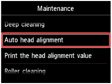 - Geçerli kafa konumu ayar değerlerini yazdırmak ve kontrol etmek için Bakım (Maintenance) ekranında Kafa hizalaması değerini yazdır (Print the head alignment value) seçeneğini belirleyin.