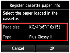 Seleccione el tamaño y el tipo de papel cargado en el cassette en Tm. pág. (Page size) y Tipo (Type), y puntee después en OK.