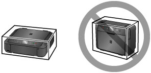 - Når du har pakket maskinen, må du ikke sette esken med maskinen på skrå, på høykant eller opp-ned. Dette kan føre til blekklekkasje under transport og forårsake skade på maskinen.