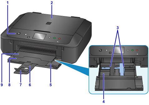 Sử dụng để thay đổi cài đặt của máy hoặc vận hành máy. Ngoài ra, nâng và mở ra để thay bình mực, để kiểm tra đèn mực hoặc để lấy giấy bị kẹt ở bên trong máy ra.