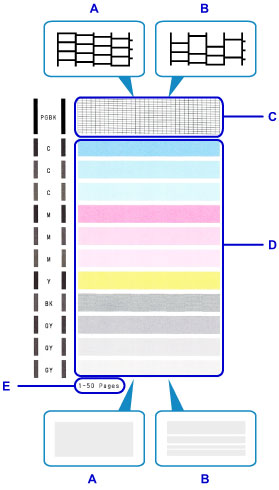 • Il numero totale di fogli stampati fino a questo momento viene mostrato con incrementi di 50 fogli nella stampa del test di controllo degli ugelli.