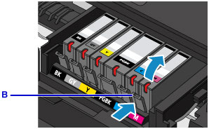탭(B)을 밀고 잉크 탱크를 올려 제거합니다.