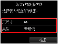 在页尺寸和类型中选择装入纸盒 2的纸张尺寸和类型,然后点击注册。