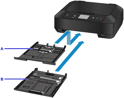 Įrenginyje yra du popieriaus tiekimo šaltiniai – 1 kasetė (A) ir 2 kasetė (B).
