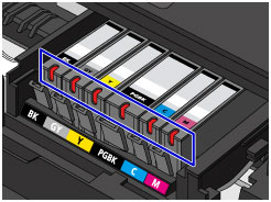 Zbiornik z atramentem został nieprawidłowo zainstalowany lub funkcja wykrywania poziomu atramentu jest wyłączona. Jeśli zbiornik z atramentem nie jest osadzony sztywno na swoim miejscu, upewnij się, że ze spodu zbiornika z atramentem została zdjęta pomarańczowa nasadka ochronna. Następnie naciskaj na górną ściankę zbiornika z atramentem, aż zbiornik z atramentem zatrzaśnie się na swoim miejscu.